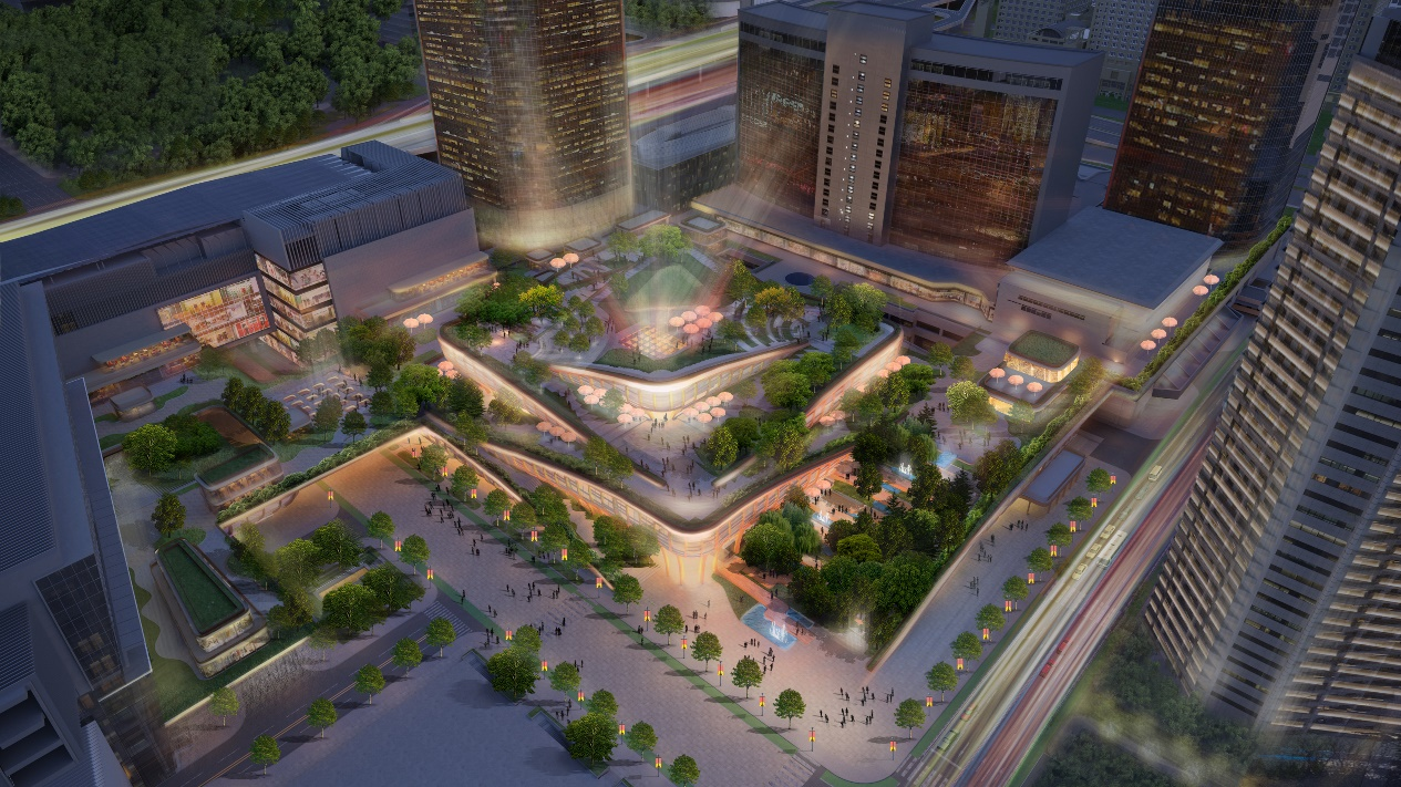 国贸星座项目位于北京市东三环中路中国国际贸易中心地块内。项目计划对原国贸饭店及南侧二期地下商业进行改造升级,打造具有文化、科技、生活、体育等元素的全新体验型公共空间。设计方案以连续的景观平台表达建筑内涵,使用木饰面质感的幕墙龙骨加强自然印象,致力于在都市中心区块营造独特的立体花园。(唐建 鞠拓文)