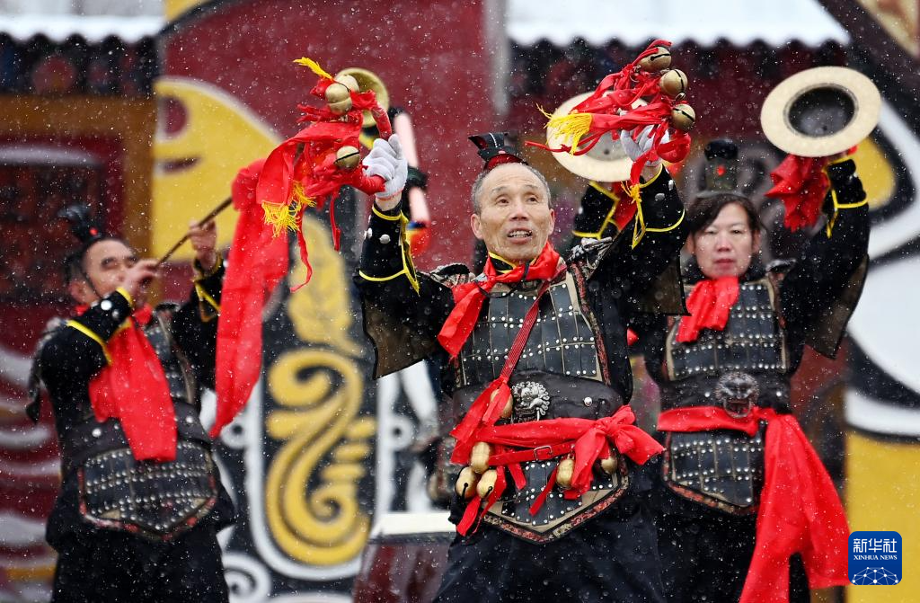 2月22日,在陇州社火过大年暨陕西省民间社火展演上,来自咸阳市的社火队在表演秦汉战鼓。