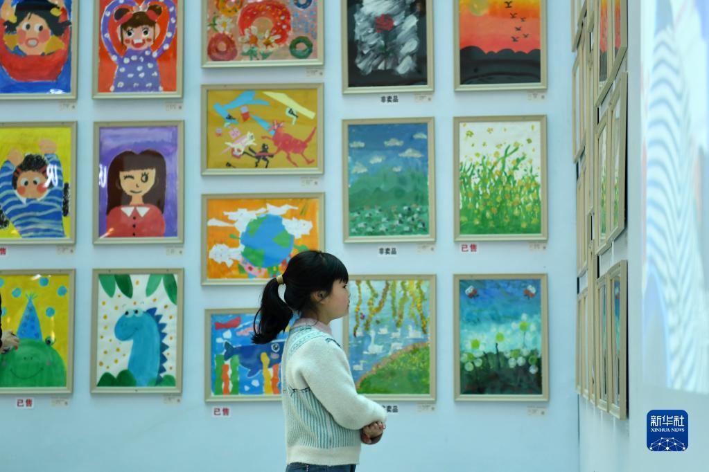 4月2日,小朋友在世界孤独症日主题慈善活动现场观看艺术画作。
