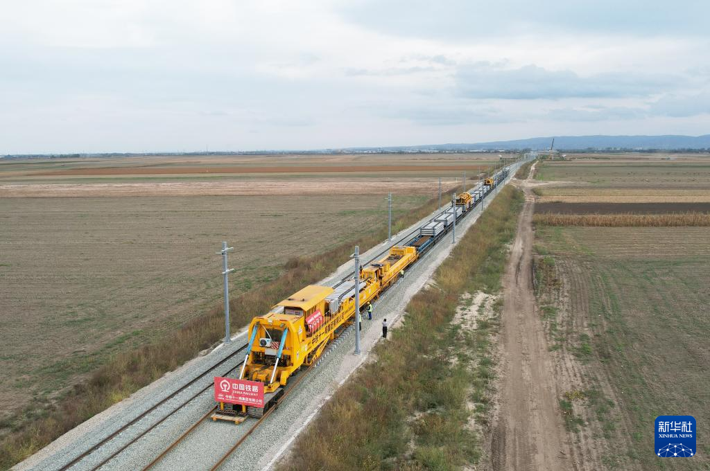 2023年10月10日,建设中的匈塞铁路塞尔维亚境内诺苏段开展铺轨作业(无人机照片)。