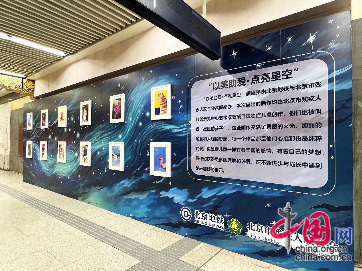 近日,“以美助爱•点亮星空”画展在北京地铁展出,画展由北京地铁与北京市残疾人联合会共同举办。本次展出的画作均由北京市残疾人服务示范中心艺术康复项目的孤独症儿童创作,。自闭症儿童也被称为“星星的孩子”。这些画作充满了灵感的火光、绚丽的笔触和大胆的想象,每一个作品都代表了他们心底最纯粹的爱。[中国网/徐林摄]