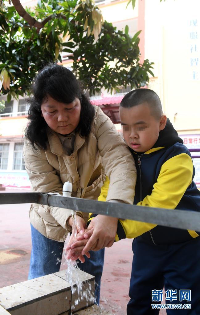 在广西南宁高新区龙华学校,何冬艳教孤独症学生洗手(新华社记者 陆波岸摄)。