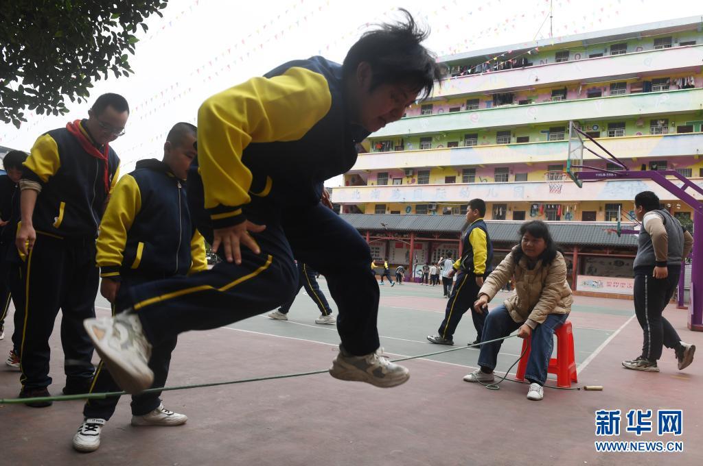 在广西南宁高新区龙华学校,何冬艳教学生跳绳(3月31日摄)。