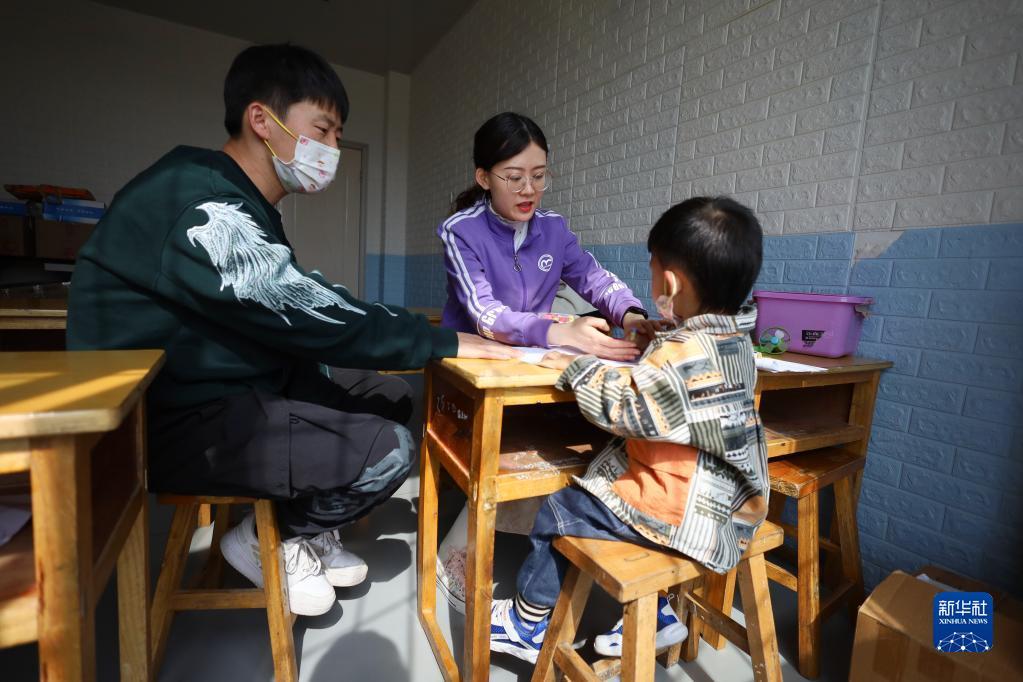 3月30日,特教老师陈进(中)为儿童进行精细动作评估。