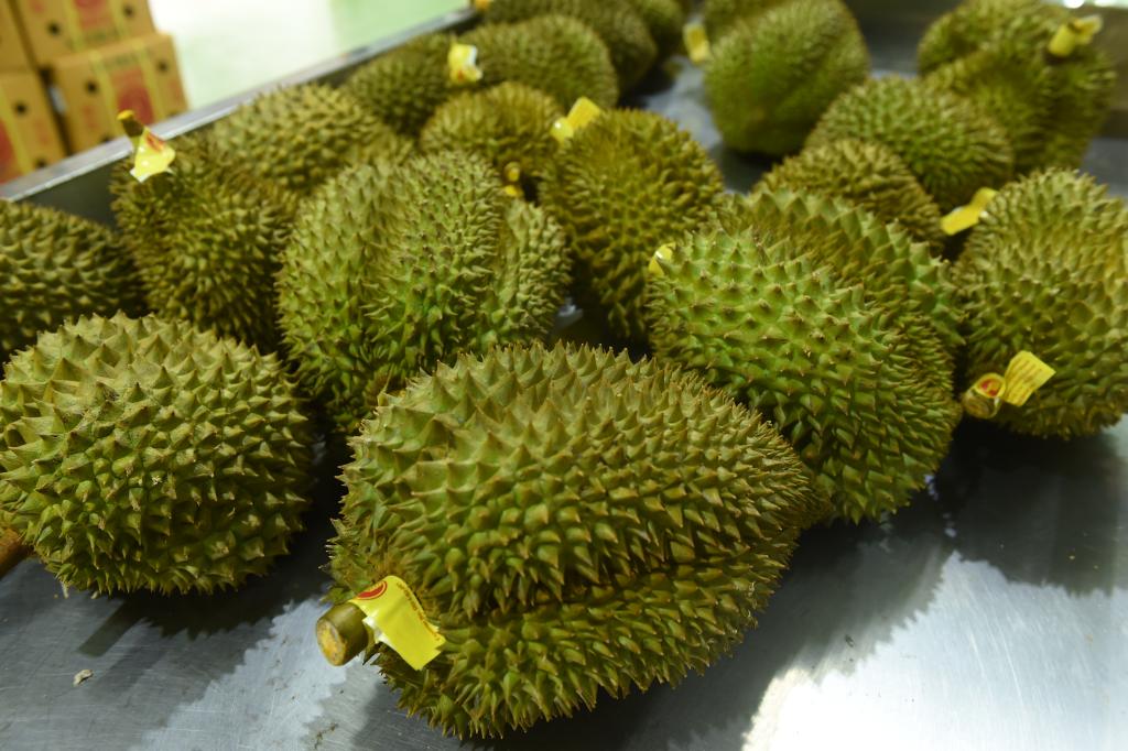 沙西通果园的榴莲被采摘后,很快被运到附近一家加工厂。这里,工人们忙碌地对新鲜榴莲进行分拣、称重、打包、装车。