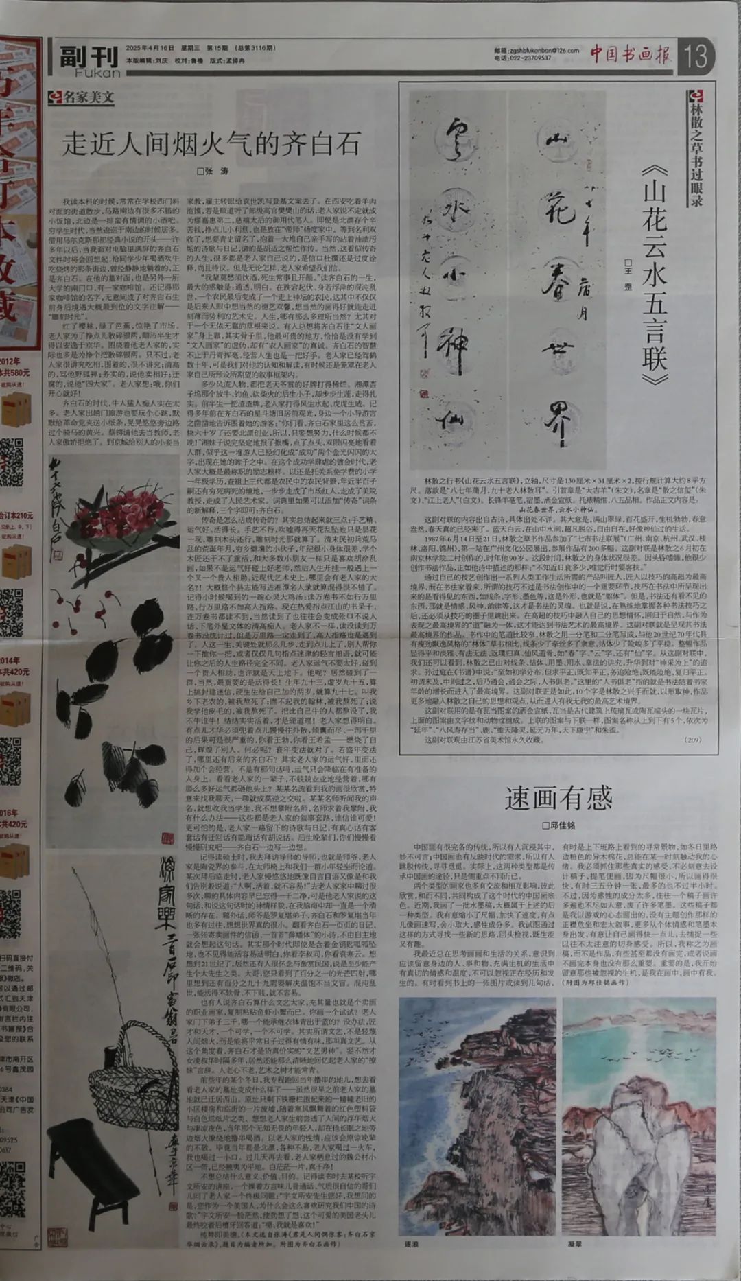 林散之行书《山花云水五言联》,2025年4月16日发表在《中国书画报》副刊第13版。此书作现由江苏省美术馆永久收藏。