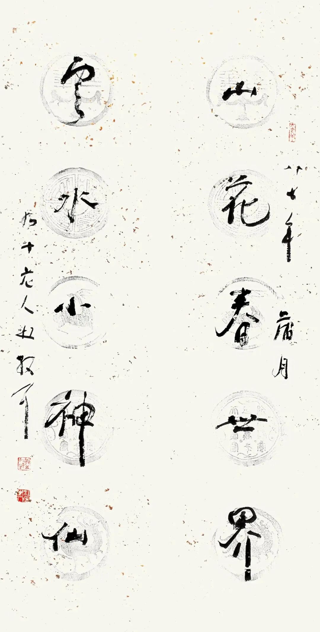 林散之行书《山花云水五言联》用的是有瓦当图案的洒金宣纸,瓦当是古代建筑上琉璃瓦或陶瓦端头的一块瓦片,上面的图案由文字纹和动物纹组成。这幅作品上联的图案与下联一样,图案名称从上到下有5个,依次为“延年”“八风寿存当”、鹿、“维天降灵,延元万年,天下康宁”和朱雀。