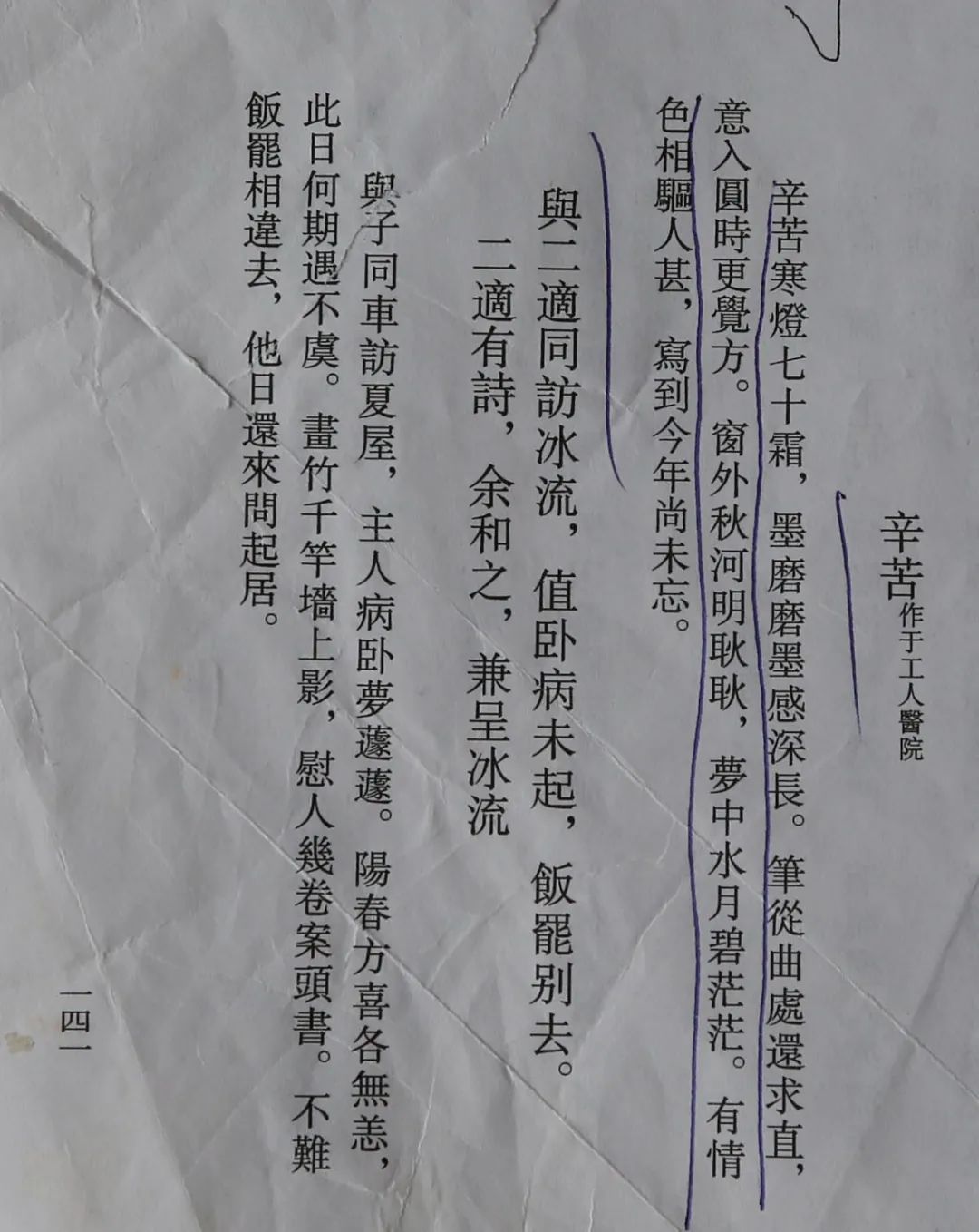 这首诗是林散之于1973年9月在江苏工人医院(今江苏省人民医院)住院期间写的,表达了对其研习书法70年的感悟。后来做了修改,“辛苦寒灯数十霜”被改为“辛苦寒灯七十霜”,“窗外明河秋耿耿”被改为“窗外秋河明耿耿”,“无端色相驱人甚”被改为“有情色相驱人甚”,“写到今年犹未忘”被改为“写到今年尚未忘”。2004年9月,这首诗被收入由文物出版社出版的《林散之诗集》,第141页。