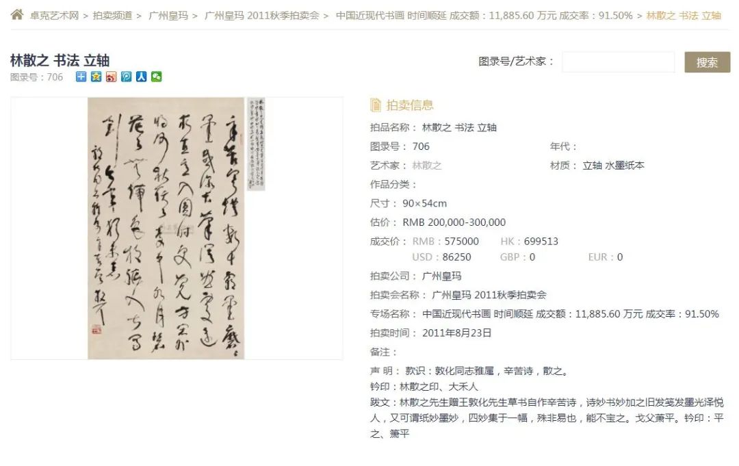 林散之草书《自作诗<辛苦>》,2011年8月23日现身“广州皇玛2011秋季拍卖会”,图录号是706,估价为200,000元至300,000元,起拍价是200,000元,成交价为575,000元。