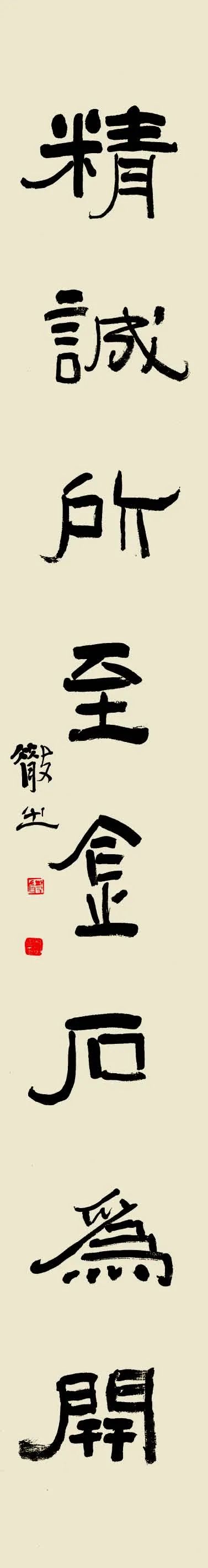 对联中的“风格”,意是艺术品整体呈现的具有代表性的面貌,这里指开宗立派的风格。“江山有助”出自宋代吕陶的诗《送唐诚老秘丞》:“越溪千里碧滔滔,匹马西游岂惮劳。文牍甚稀如吏隐,江山有助作诗豪。和风尽日生眉宇,白发何年上鬓毛。好向尧庭露华彩,韶音方奏德辉高。”“金石为开”是成语,出自汉代刘向《新序·杂事四》:“熊渠子见其诚心,而金石为之开,况人心乎?” 上下联的大意是,独特创作风格的形成,得益于对大自然的深刻认识和感悟。只要心诚志坚,努力去做,任何事情都可以成功。
