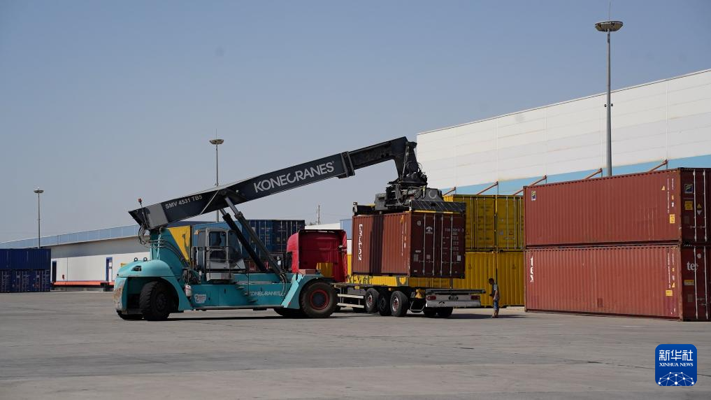 9月9日,巴库阿普歇伦物流中心内正在进行集装箱卸载作业。新华社记者 刘书辰 摄