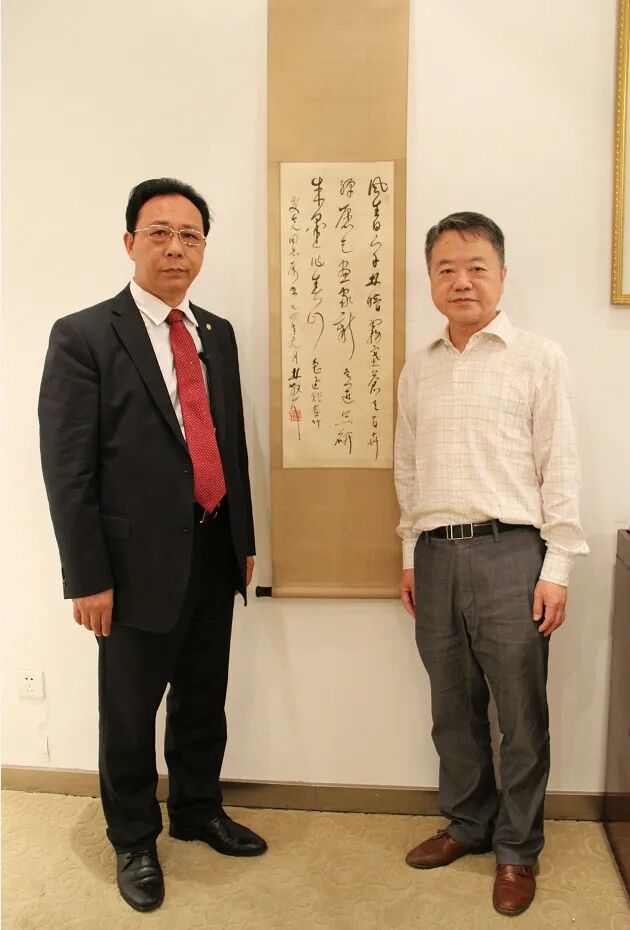 图为王罡(左)和金万泉的儿子金年在林散之纪念馆与林散之草书《鲁迅<赠画师>》合影