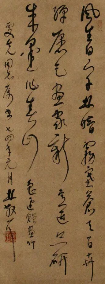 林散之在江浦县当副县长期间,金万泉是他的秘书。金万泉是南京浦口区人,1934年生,1950年3月参加工作,曾任江浦县政府办公室秘书、综合科科长、县经济体制改革委员会副主任等职。这里要说明的是,金万泉不是林散之的专职秘书,他同时还要服务其他副县长。因为金万泉字写得好,又比较喜欢书法,所以就和副县长林散之走得比较近。林散之调到南京后,金万泉与老县长一直保持联系。1974年1月,金万泉和夫人张雯先一起到南京百子亭22号看望老县长林散之,林散之专门为他夫人写了这幅草书,内容是鲁迅的一首诗。当时正值农历虎年的前几天,全国上下都在批林批孔,“林”就是林彪,“孔”就是孔子,全国人民都在向鲁迅学习,林散之就以鲁迅的诗为内容写了这幅草书作品。