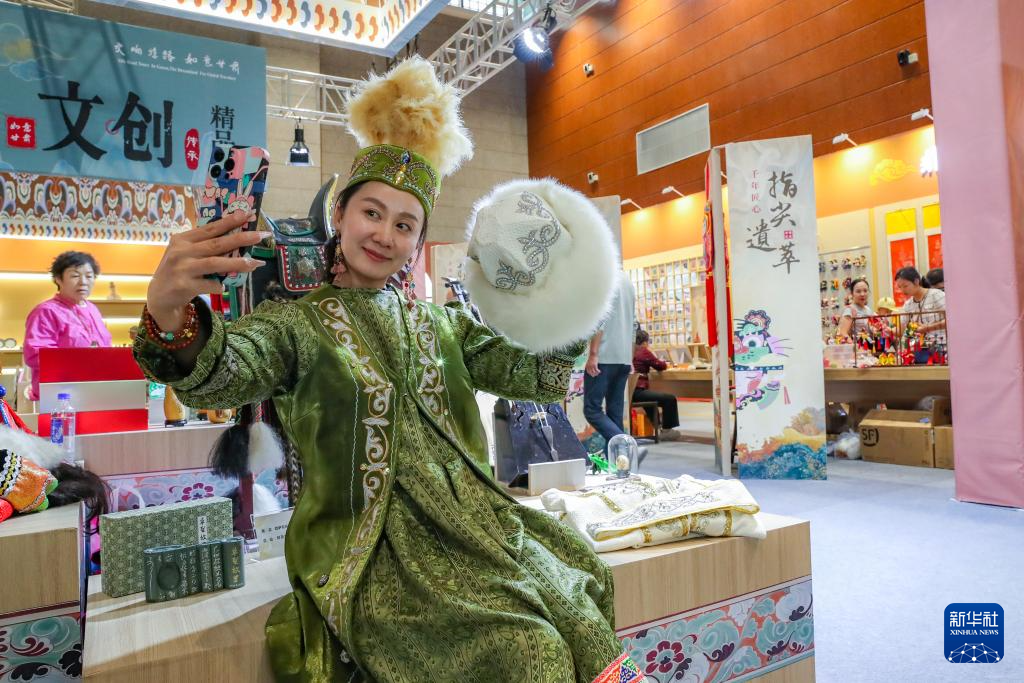 9月22日,游客在敦煌文博会上的一个展览现场身穿民族服饰自拍。