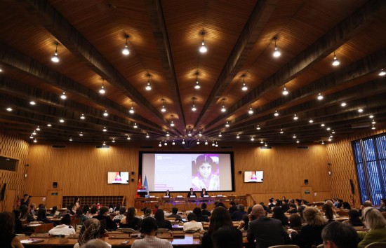 3月7日,在瑞士日内瓦万国宫,中国代表在联合国国际劳动妇女节纪念活动暨北京世界妇女大会三十周年对话会上讲话。新华社记者 连漪摄