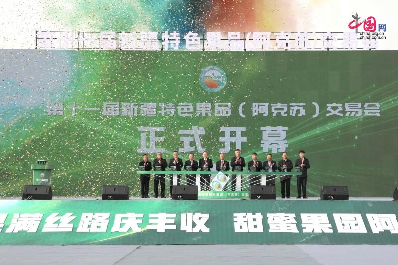 中国网/中国发展门户网讯 10月17日,第十一届新疆特色果品(阿克苏)交易会开幕式在阿克苏市电影小镇举行。交易会通过搭建展示展销、品牌推介、贸易洽谈、农文旅融合对接平台,推动阿克苏乃至新疆特色农产品走向全国、走向世界。