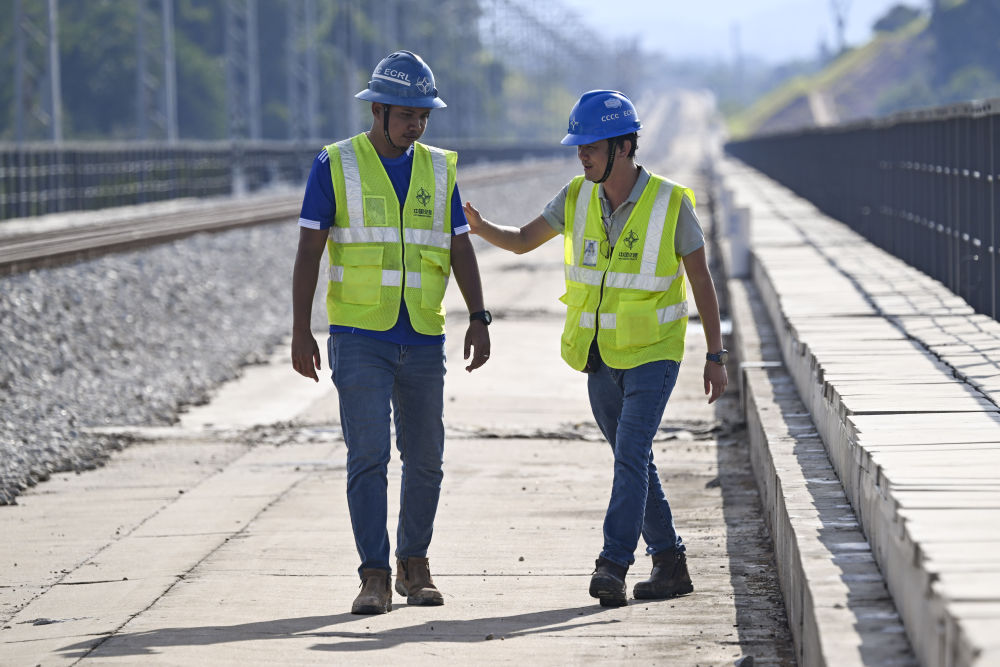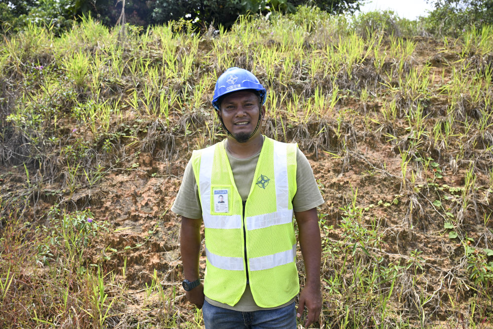 ↑10月10日,在马来西亚彭亨州马东铁项目,环境官穆罕默德·斯亚哈丹·本·伊斯梅尔(左)和安全官何健耀联合巡查。