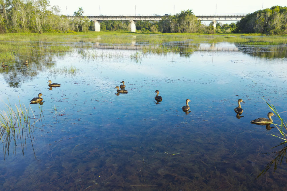 ↑这是10月10日在马来西亚彭亨州马东铁项目附近拍摄的几只野鸭(无人机照片)。