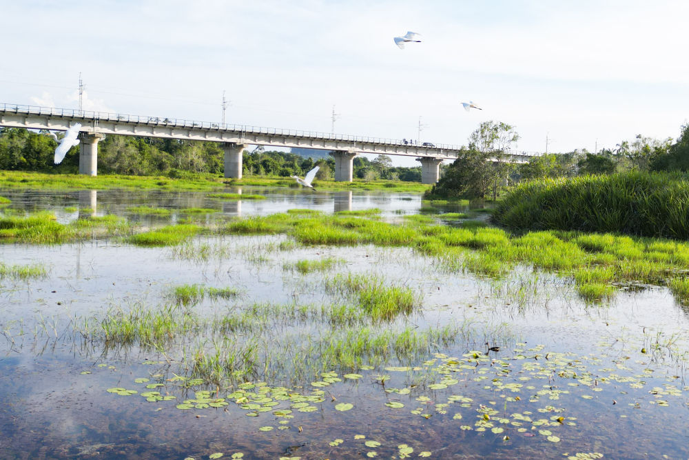 ↑10月9日,在马来西亚彭亨州,马东铁轨道穿越一片湿地(无人机照片)。