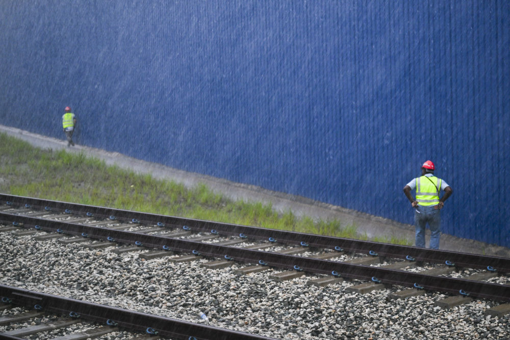 ↑10月9日,在马来西亚彭亨州,马东铁项目工人在雨幕中忙碌。
