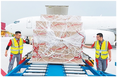 工人正在卸载京东物流国际货运航班运回的东盟商品。