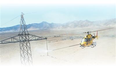 在智利北部阿塔卡马沙漠,直升机清除绝缘子上的积污。