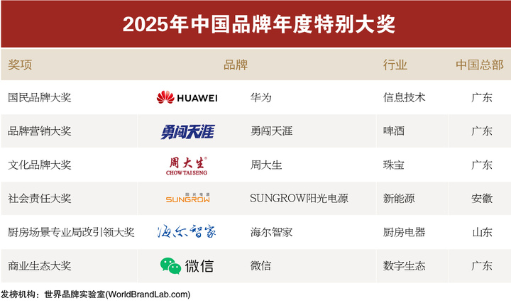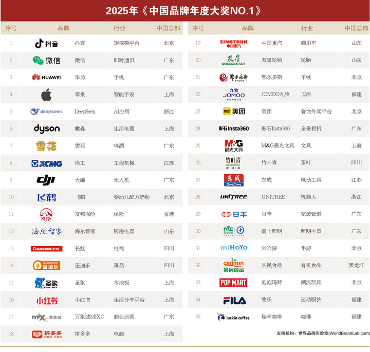 2025年“中国品牌年度大奖”评选在“世界经理人峰会”上隆重揭晓。这项被誉为“中国品牌奥斯卡”的权威奖项,由世界品牌实验室(World Brand Lab)于12月17日在香港颁发。华为、雪花、徐工、圣象、飞鹤、中国重汽、海尔智家、雷士照明、九牧、双星轮胎、竹叶青和东成等35个在中国经济舞台上表现突出的领军品牌,荣膺“2025年中国品牌年度大奖”(NO.1)。