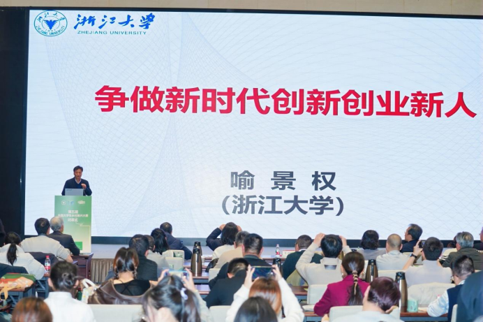 图为中国工程院院士喻景权以《争做新时代创新创业新人》为题做主旨报告。
