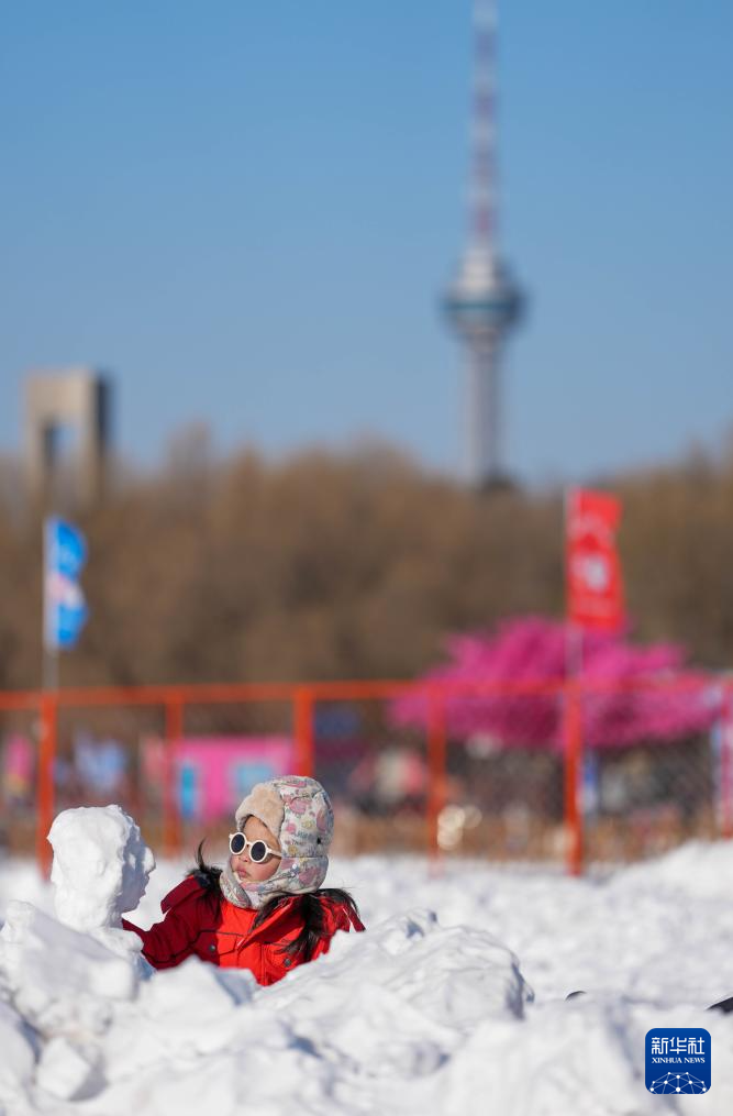 1月5日,小朋友在长春市南湖公园堆雪人。