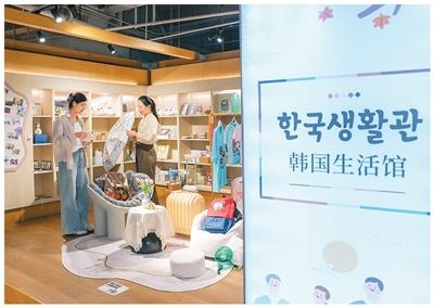 图为2025年10月,游客在江苏盐城中韩文化客厅韩国生活馆内选购商品。