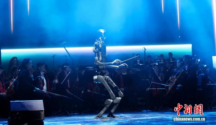 12月28日,江西南昌,AI机器人“智音”执棒出场。当晚,“潮涌赣鄱乐动新年”2026江西新年音乐会在江西艺术中心大剧院上演。音乐会开篇,AI机器人“智音”作为“音乐指挥家”亮相,其演绎的两首“AI原创”作品由中央音乐学院人工智能作曲系统打造,为观众呈现了一场充满未来感的视听盛宴。中新社记者刘占昆 摄