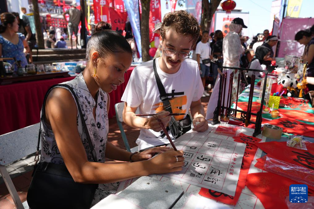 2月1日,人们在南非开普敦维多利亚港区举行的中国年庆祝活动上体验中国书法。新华社记者 王雷 摄
