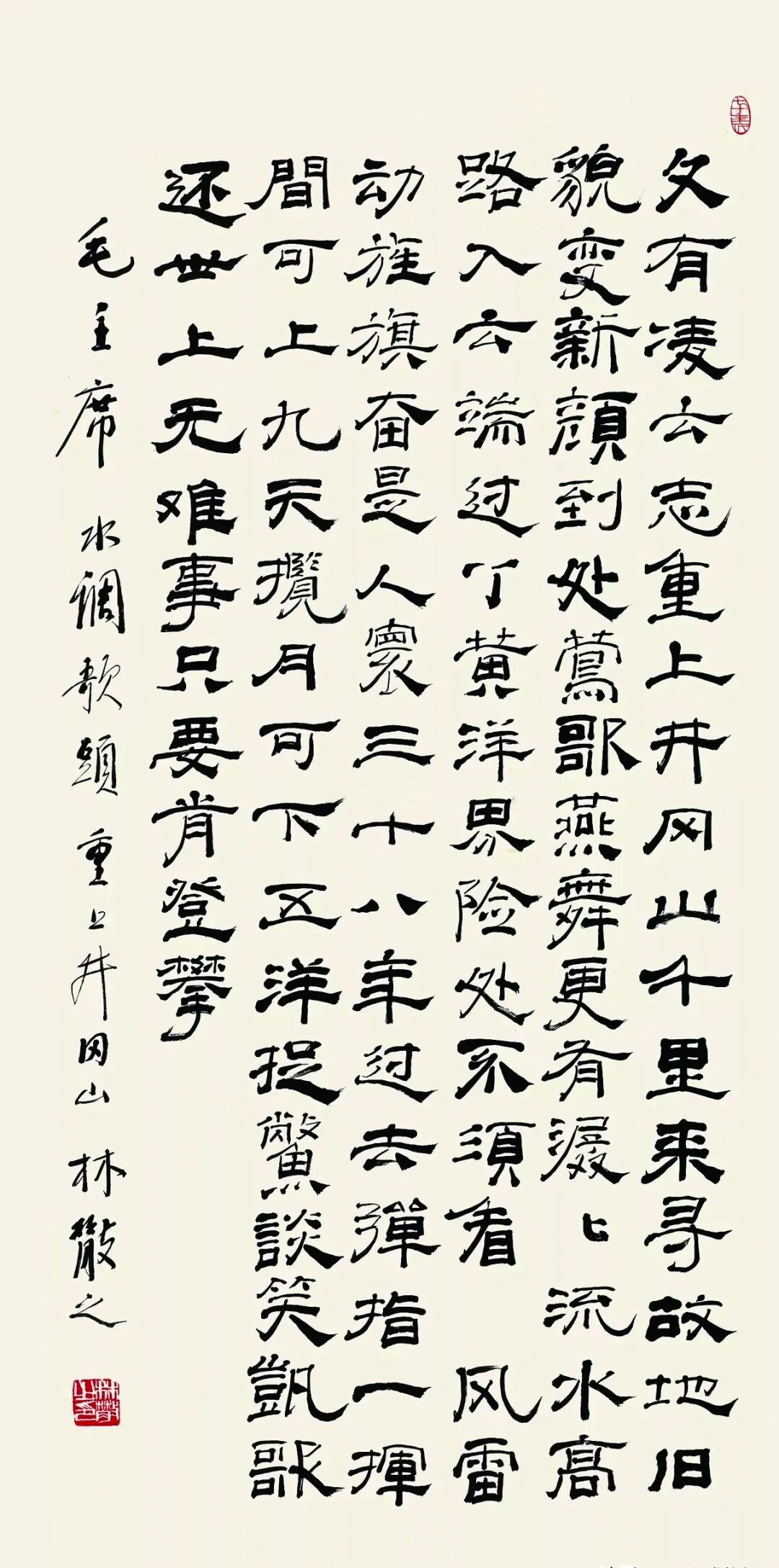 1976年元旦,中央以重大新闻的形式发表了毛泽东的《水调歌头·重上井冈山》和《念奴娇鸟儿问答》,同时发表的经过毛泽东圈阅的“两报一刊”元旦社论写道:“发表这两首词具有重大的政治意义和现实意义。”元旦当天,全国各大报刊全都刊载,接着全国各地掀起了宣传学习的高潮。林散之就是在这个大背景下创作了隶书《毛泽东<水调歌头·重上井冈山>》。