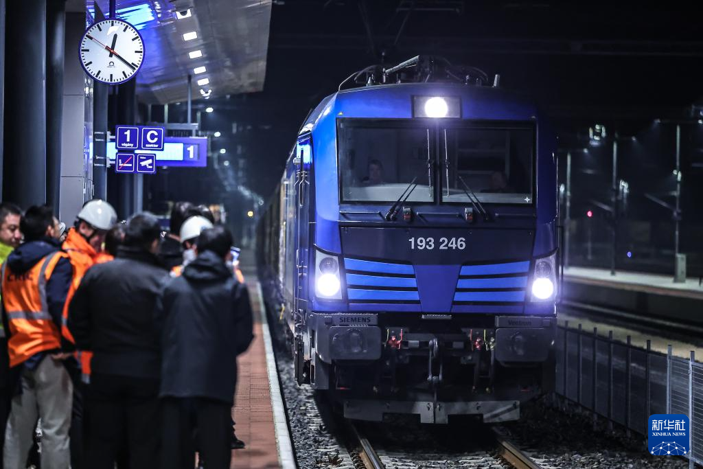 2月27日,在匈牙利布达佩斯,一列货运列车驶离匈塞铁路匈牙利段绍罗克沙尔火车站。新华社发(鲍洛格·达维德摄)