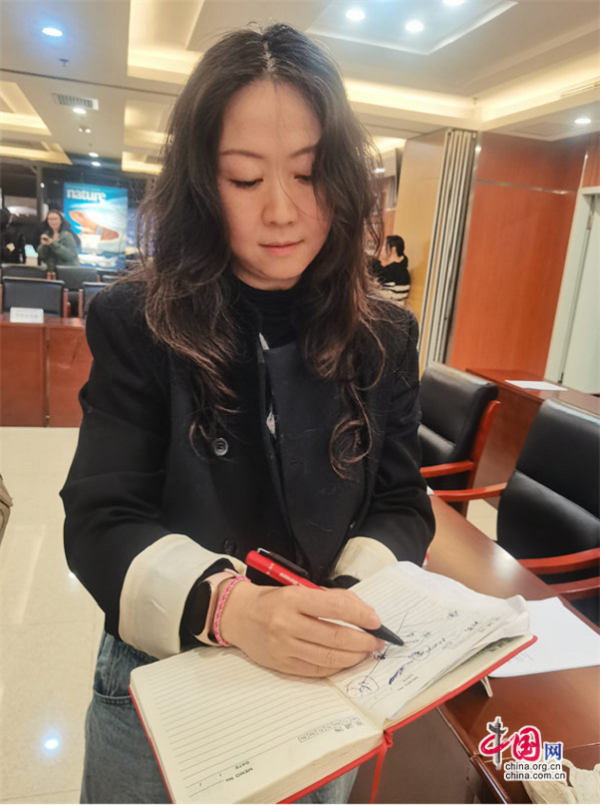 图为中国科学院古脊椎动物与古人类研究所研究员卢静画图解释宏颌鱼牙齿排列。中国网 王振红摄
