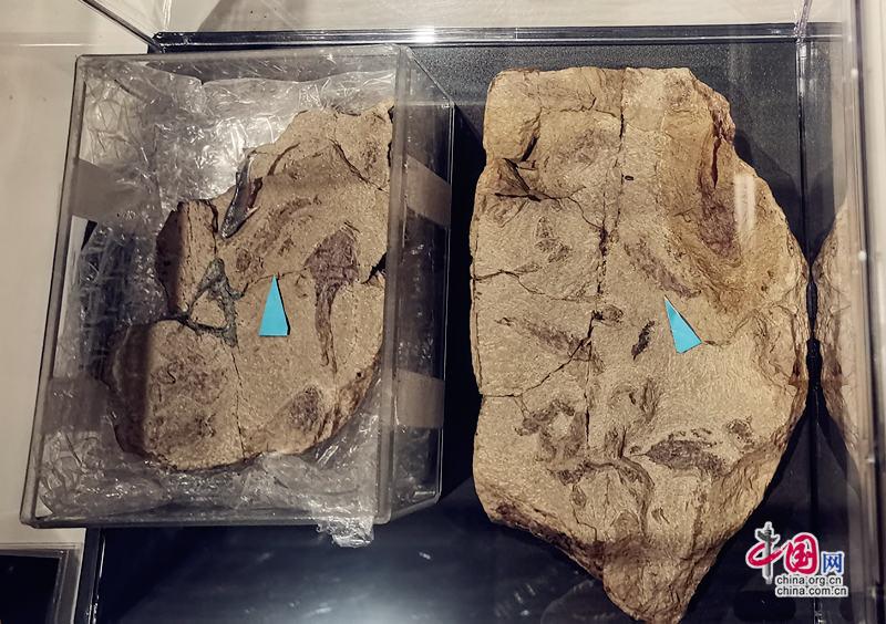 图为重庆始骨鱼化石(蓝色箭头所指)。中国网 王振红摄