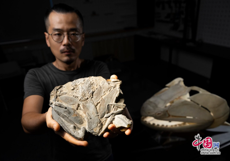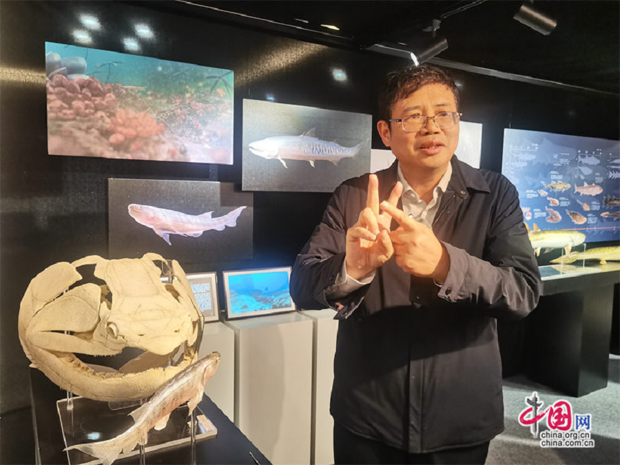 图为中国科学院古脊椎动物与古人类研究所朱幼安研究员展示钝齿宏颌鱼化石。赵钢 摄