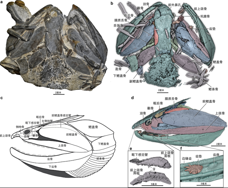 图为钝齿宏颌鱼化石及高精度CT重建。a.宏颌鱼照片;b.宏颌鱼三维重建;c.宏颌鱼头部骨片复原线图;d.宏颌鱼头部骨片位置复原;e.前上颌骨放大,显示与全颌盾皮鱼类相似的面板与腭板结构;f.下颌局部放大,显示着生在齿座上的齿垫结构。