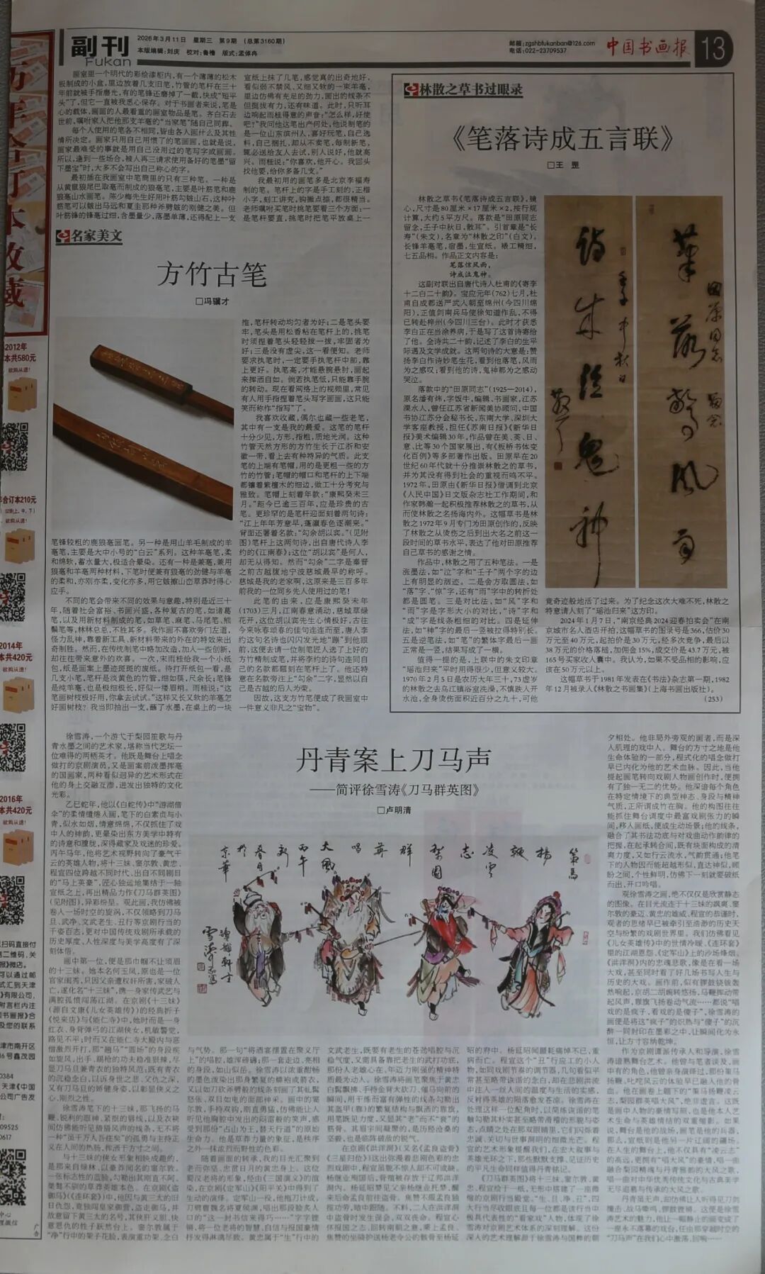 林散之草书《笔落诗成五言联》,1981年发表在《书法》杂志第一期第30页,1982年12月著录在《林散之书画集》第21页(上海书画出版社),2026年3月11日发表在《中国书画报》第13版。
