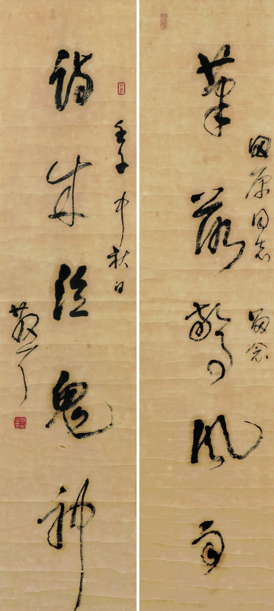 林散之草书《笔落诗成五言联》是极精之作。在作品中,林散之用了五种笔法。一是涨墨法,如“泣”字和“壬子”两个字的边上有明显的洇迹。二是舍方取圆法,如“落”字、“惊”字,还有“雨”字中的转折处都是圆笔。三是对比法,如“风”字和“雨”字是字形大小的对比,“诗”字和“成”字是线条粗细的对比。四是延伸法,如“神”字的最后一竖拉得特别长。五是逆笔法,如“笔”的繁体字最后一画正常是一竖,结果写成了一横。