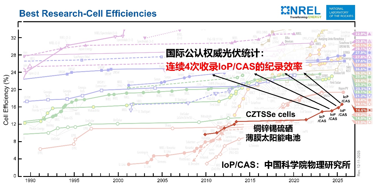 中国网/中国发展门户网讯 近日,中国科学院物理研究所/北京凝聚态物理国家研究中心孟庆波团队再次实现新型薄膜光伏铜锌锡硫硒(CZTSSe)性能突破,将电池权威认证效率提升至16.6%,并完成高性能柔性电池及组件研制,第10次刷新该领域世界纪录。这些纪录连续收录在多国光伏专家联合发布的“太阳能电池效率表”、美国国家实验室发布的“最佳研究电池效率表”中,标志我国在新型光伏领域实现全球领跑,技术迈过产业化关键门槛。