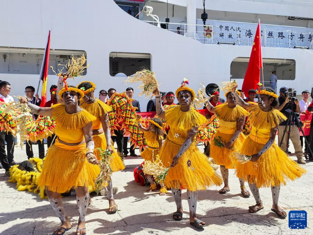 4月8日,执行“和谐使命-2025”任务的中国海军“丝路方舟”号医院船抵达巴布亚新几内亚莫尔兹比港,当地民众在码头欢迎仪式上表演舞蹈。新华社发(崔晓洋摄)