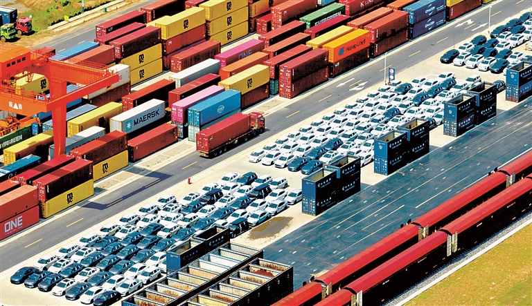 在合肥派河港铁路物流基地拍摄的等待装车出口的新能源汽车。新华社发