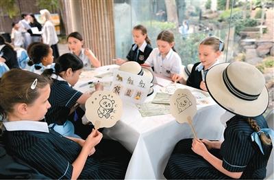 在澳大利亚阿德莱德动物园举办的“国际中文日”活动中,学生写汉字“熊猫”并绘画。