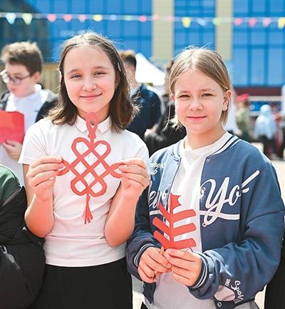 在哈萨克斯坦阿拉木图举办的“国际中文日”庆祝活动上,学生展示剪纸作品。